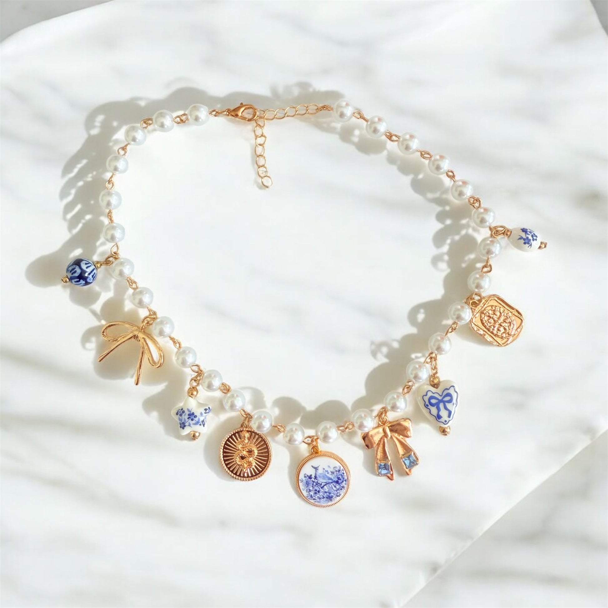Enhance your style with Blue Darling, featuring a charming mix of pearls and gold accents complemented by captivating blue and gold charms. Elevate any outfit with this elegant and eye-catching accessory.